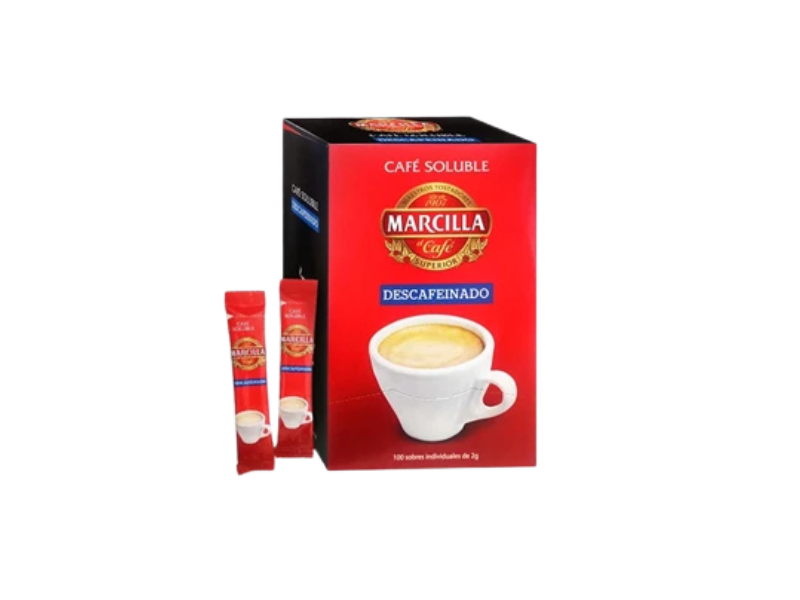 Sobres individuales de 2 g. Vierta en una taza el contenido del sobre de Café Marcilla Soluble. Añada agua o leche caliente a su gusto y remueva para disolver.